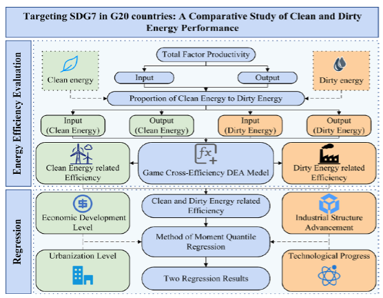 在实现联合国可持续发展目标7(SDG7)的背景下,提升能源效率已成为G20国家推动绿色转型的关键路径。清洁能源与化石能源在效率表现上存在显著差异,这一差异对制定差异化能源政策具有重要启示。然而,当前研究多未区分清洁与脏能源的效率差异,也缺乏针对G20国家系统性效率评估与影响因素分析。
