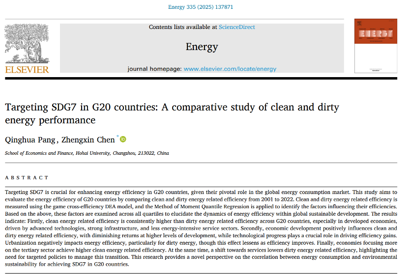 近期,我院庞庆华教授团队以河海大学为唯一单位在能源领域知名学术期刊《Energy》(中科院一区Top期刊, IF 9.4)发表了题为“Targeting SDG7 in G20 countries: A comparative study of clean and dirty energy performance”的研究成果。在实现联合国可持续发展目标7(SDG7)的背景下,提升能源效率已成为G20国家推动绿色转型的关键路径。清洁能源与化石能源在效率表现上存在显著差异,这一差异对制定差异化能源政策具有重要启示。然而,当前研究多未区分清洁与脏能源的效率差异,也缺乏针对G20国家系统性效率评估与影响因素分析。 针对上述问题,该研究首次将能源划分为清洁能源(如天然气、太阳能、风能等)与脏能源(如煤炭、石油),并采用博弈交叉效率DEA模型,对G20国家2001–2022年的清洁能源效率(CEE)与脏能源效率(DEE)分别进行评估。进一步,针对效率得分的非正态分布特征,研究运用矩分位数回归方法(MMQR),系统分析了经济发展、城市化、技术进步与产业结构对两类能源效率的异质性影响。研究结果显示